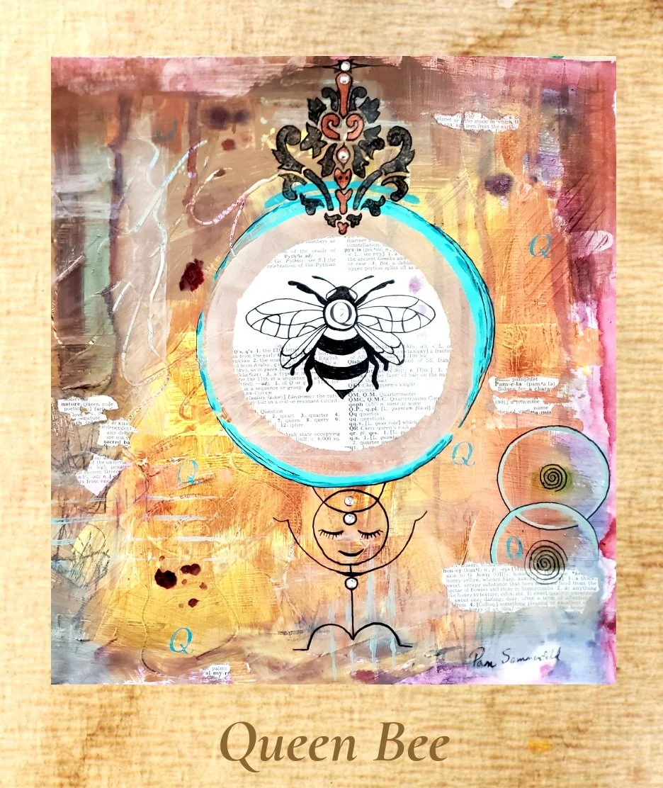 The Queen Bee is a symbol of motherhood and a reminder to prioritize your emotional and physical growth and change. She leads by intuitive truth through emotions, heart and creativity. She is the matriarch who honours her own truth while understanding and guiding the hive to the bigger plan and purpose.